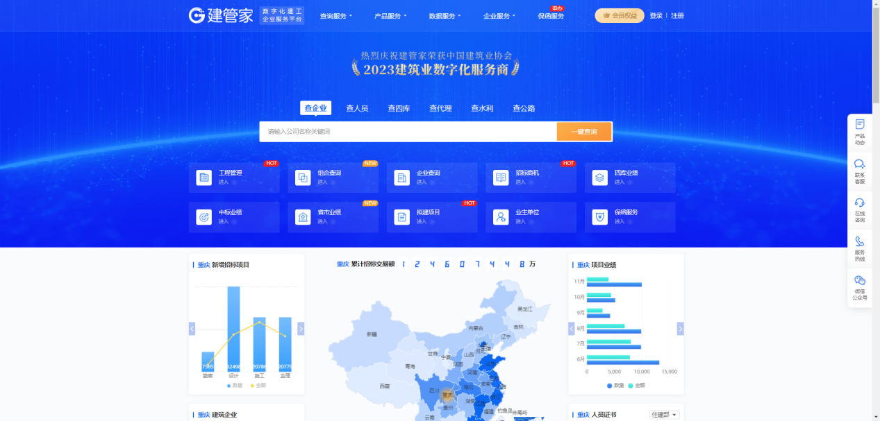 建管家综合大数据服务平台,助您解决以上所有问题!我们提供组合查、查企业、查人员、查四库、查省市、查中标、查水利、查公路、查招标、查拟建、查代理、查业主、查信用、人员查缺、资质溯源等多项服务,让您轻松掌握企业及行业实时动态。