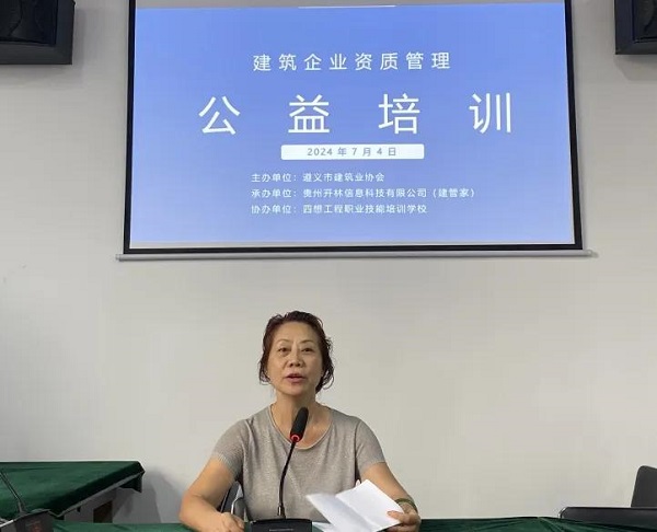 遵义市建筑业协会副会长兼秘书长杨淑琼向前来参会的领导和企业负责人表示感谢,在会中提醒各相关建筑企业要高度重视资质换领、延续工作,同时希望在场的企业代表可以珍惜此次培训机会,充分认识资质改革的必要性,了解资质改革新动向,理解掌握资质管理的最新政策规定和申报的程序要求,适应资质改革后行业发展的新形势,切实提升企业自身核心竞争力,推动贵州省建筑行业取得新进展、新成效、新突破!