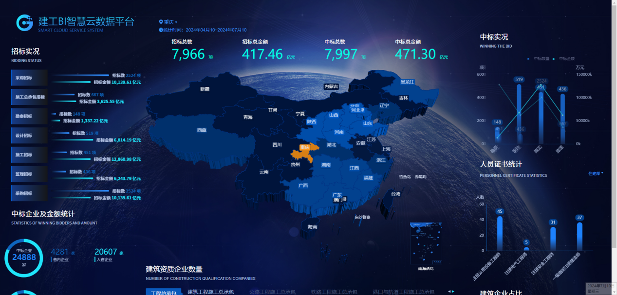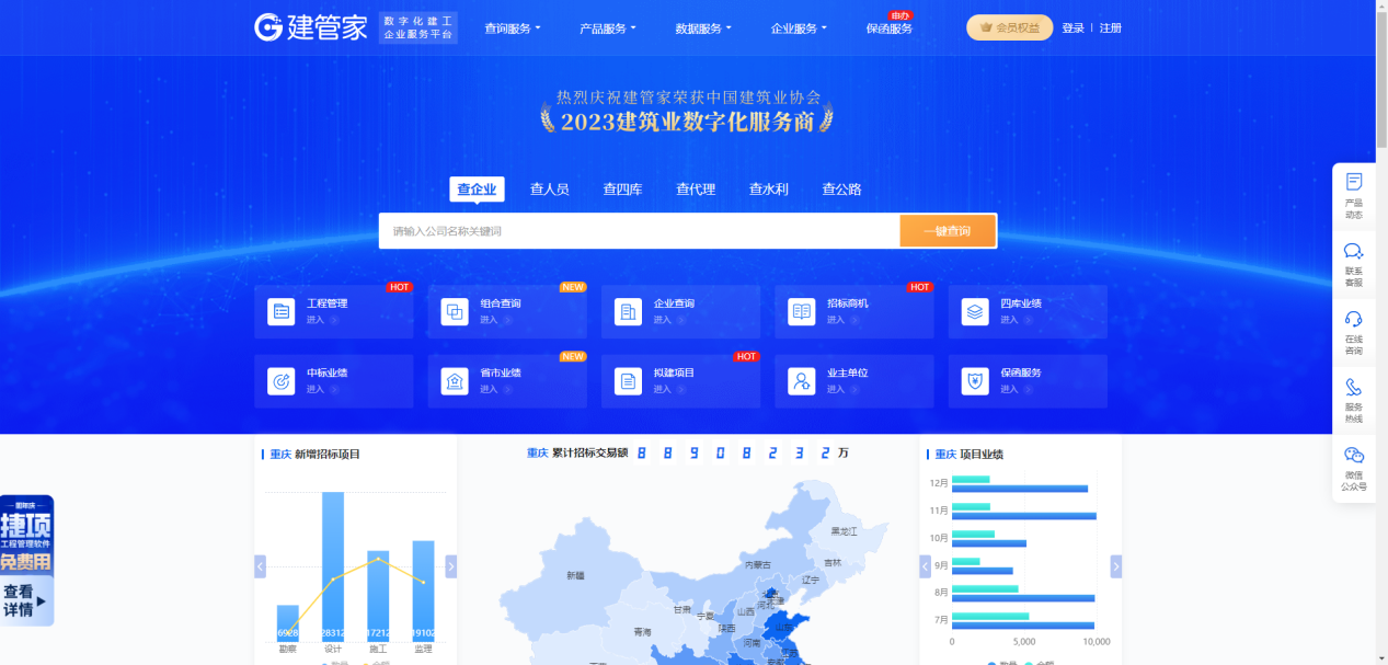 建管家综合大数据服务平台是一个效率型工具,为建筑企业提供建筑行业、企业、人员、工程项目等多方面的数据查询、应用和定制服务。本次平台开放包含了所有核心功能板块,包含组合查、查企业、查人员、查四库、查省市、查中标、查水利、查公路、查招标、查拟建、查代理、查业主、查信用,用户可根据自身需求进行免费查询。截止到2024年7月31日,注册建管家大数据平台,即可免费领取SVIP会员,不限次数全站通查,助力建筑企业快速掌握对手及行业实时动态,把握市场先机!