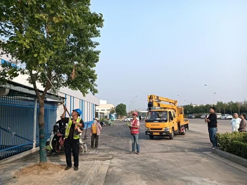 修剪现场,市园林处技术人员将修剪方法、修剪时间、技术步骤、常见绿化病虫害种类等方面给园区绿化养护人员进行了简要培训,特别是对树势设计,枝干疏除等修剪技巧进行了重点讲解,同时根据现场树木长势情况制定了修剪方案。随后,园区养护人员在专家的指导下进行了实操作业,大家利用平头剪、高枝锯、登高车等修剪工具设备,对树木存在的病虫枝、干死枝、徒长枝和近电枝进行了逐步清理,经过近三个小时的紧张作业,顺利完成了该园区主要路段的树木修剪工作,修剪后的行道树,行列对称,树形规整,景观突显,隐患消除。