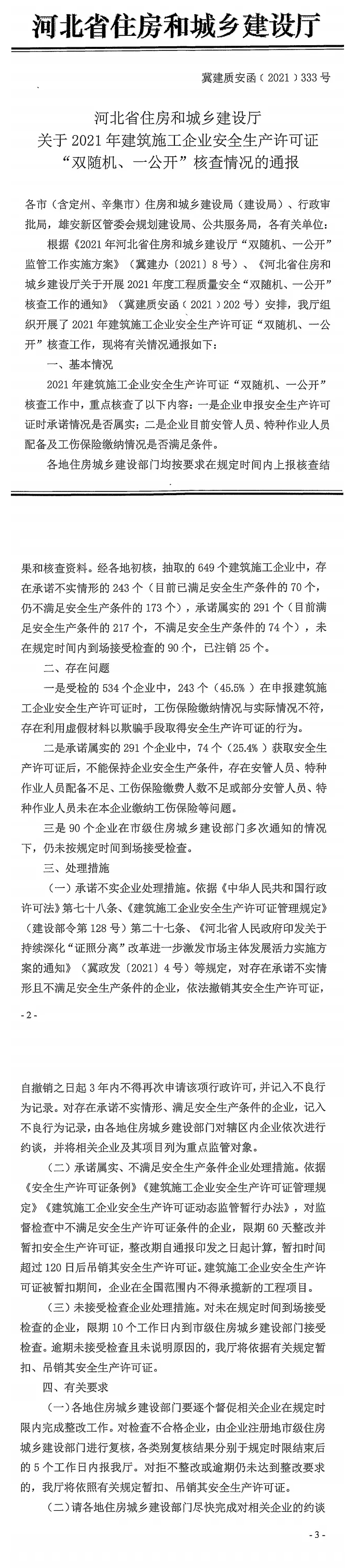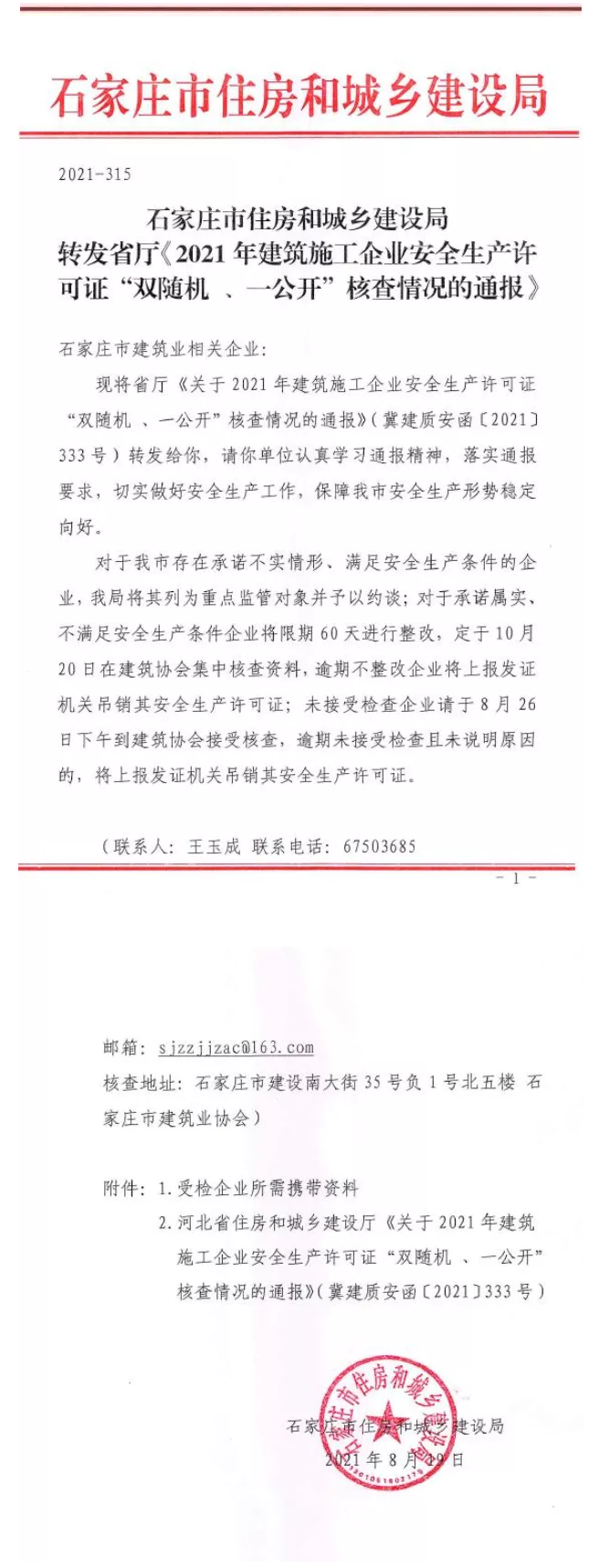 石家庄住房和城乡建设局转发省厅《2021年建筑施工企业安全生产许可证“双随机 、一公开”核查情况的通报》