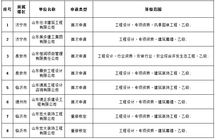 根据《建设工程勘察设计管理条例》(国务院令第662号)、《建设工程勘察设计资质管理规定》(住房城乡建设部令第160号)、《住房和城乡建设部办公厅关于扩大建设工程企业资质审批权限下放试点范围的通知》和《山东省行政程序规定》等文件,我厅对近期申报工程勘察设计资质的审查情况进行了公示,并经公示无异议,现将我厅核准的2021年第十二批工程勘察设计资质(含部下放)的单位名单予以公布。未予核准的单位可登录山东省人民政府全国一体化在线政务服务平台.山东-法人登陆-个人中心(http://www.shandong.gov.cn/col/col94091/)查询具体原因。