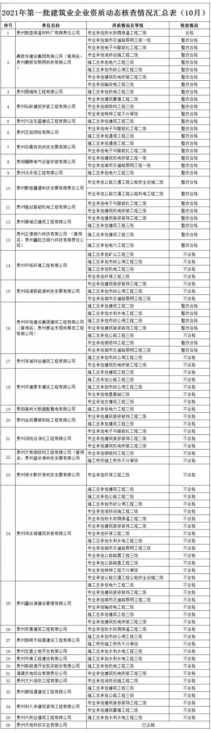 本次共计核查36家建筑业企业,经审核,符合标准1家,在整改期间自行注销资质1家,整改合格13家,不符合资质标准企业21家,根据《建筑业企业资质管理规定》第二十八条,市住建局研究决定,撤回贵州中拓环境工程有限公司等21家不符合资质标准的施工企业相应资质,并向社会公布。