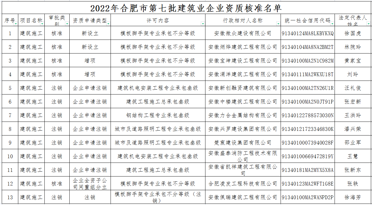 关于合肥市2022年第七批建筑业企业资质核准名单的公告