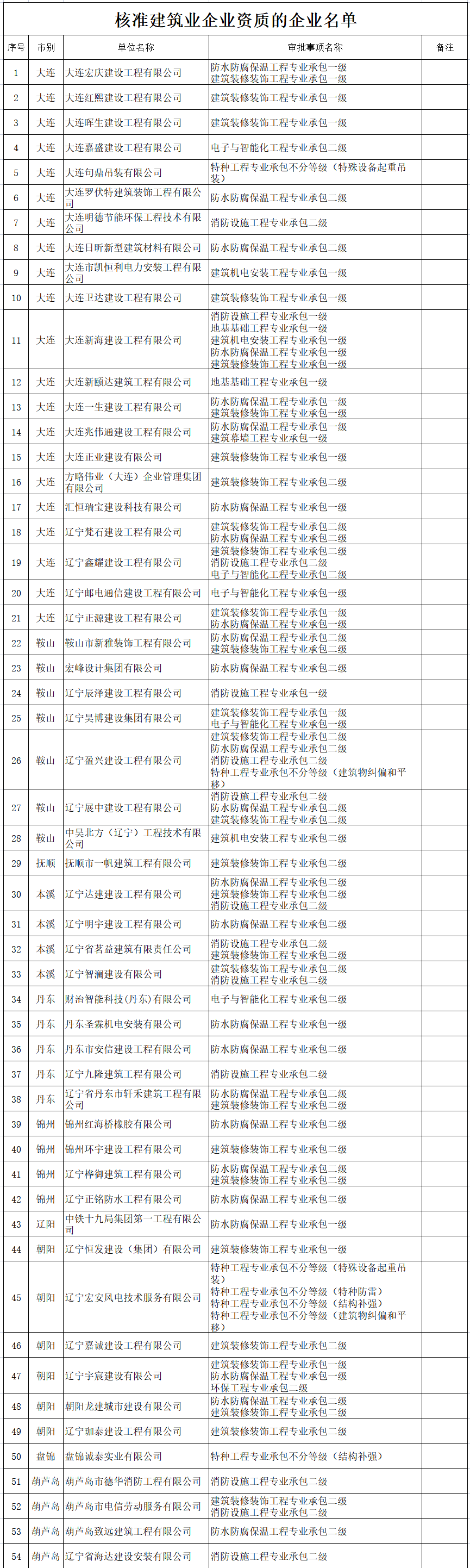辽宁省住建厅关于核准建筑业企业资质资格名单的公告