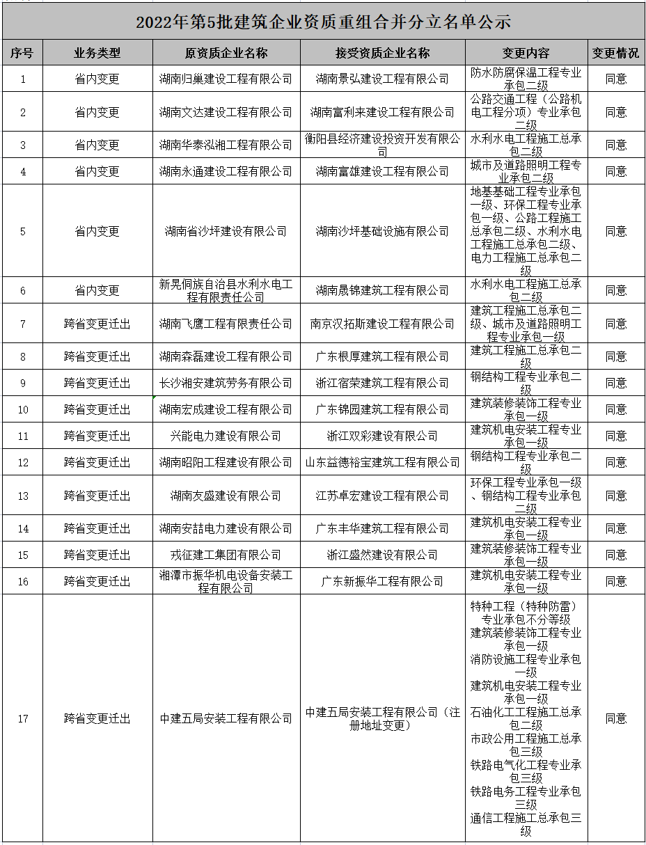 湖南省住建厅关于2022年第5批建筑业企业发生重组合并分立等情况资质核定名单的公示