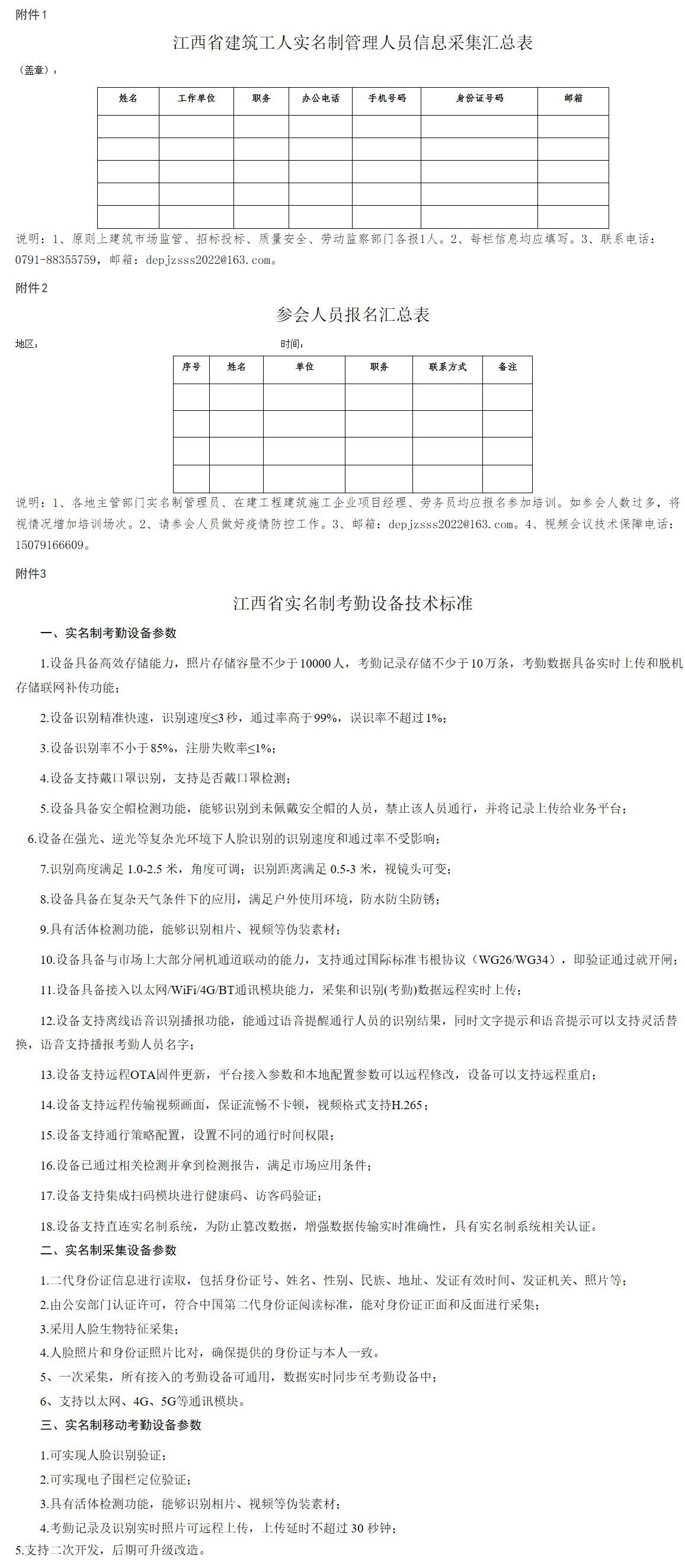 二、请各地从建筑市场监管、招标投标、质量安全、劳动监察部门中各报1人信息,用于开通实名制管理平台账号,各设区市住房和城乡建设局、赣江新区城乡建设和交通局负责汇总后报送我厅。为保障新平台顺利上线运行,定于7月28日9:30组织开展线上视频培训,我厅设主会场,各市县(区)设分会场,各在建工程建筑施工企业项目经理、劳务员应按照属地原则参加培训。实名制管理人员信息采集和各地参加培训人员名单请各设区市住房和城乡建设局、赣江新区城乡建设和交通局汇总后,于7月26日17:00前报至省建筑业发展服务中心产业发展科。