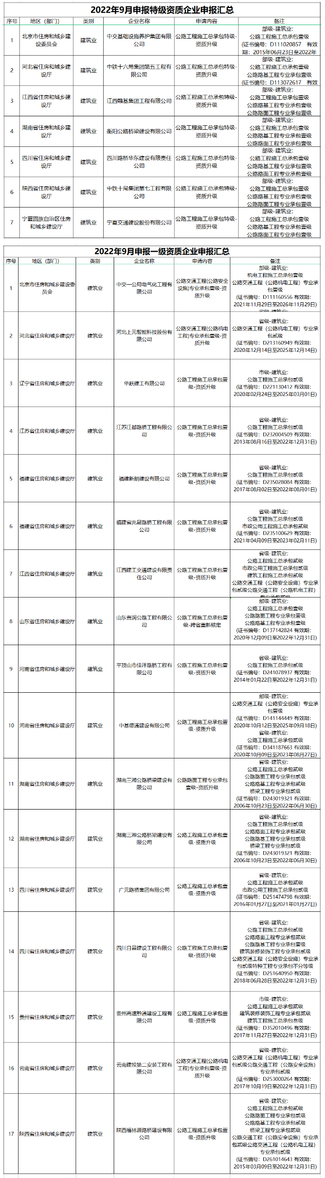 为保证申请资质企业相关情况的真实性和资质评审工作的准确、公正,现将近期申请公路工程设计、施工资质的企业有关情况予以公示,接受社会监督。公示时间为2022年9月13日至2022年9月19日。
