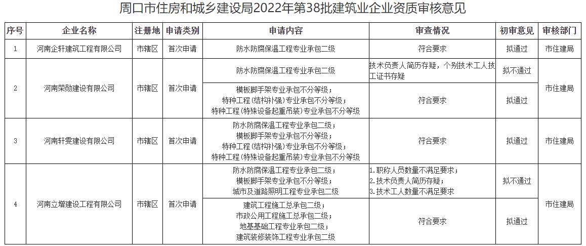 周口市住房和城乡建设局关于2022年第38批建筑业企业资质审核情况的公示
