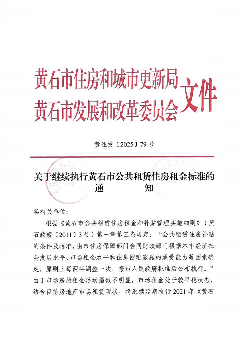 关于继续执行黄石市公共租赁住房租金标准的通知