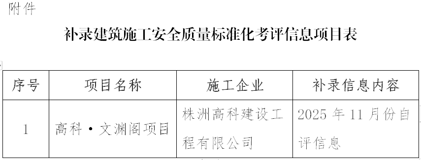 根据《关于进一步做好湖南省建筑市场监管公共服务平台工程数据信息管理的通知》(湘建建函〔2025〕10号)等有关规定,经我局研究,拟对高科·文渊阁项目安全质量标准化考评信息进行补录。如无异议,我局将开放平台操作权限,由项目考评主体进行补录。
