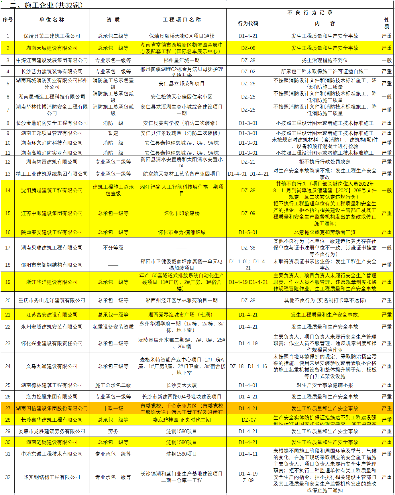 全省2023年第二批建筑市场责任主体不良行为记录经各市州及有关单位核查并报送我厅审核,共记录建设单位18家(次)、建筑业企业32家(次)、监理企业3家(次)、其他单位18家(次),注册建造师66人(次)、监理工程师54人(次)、其他个人83人(次),现予公布(见附件)。责任单位不良行为记录公布期限为本通知发布之日起180天,责任人不良行为记录公布期限为本通知发布之日起720天。