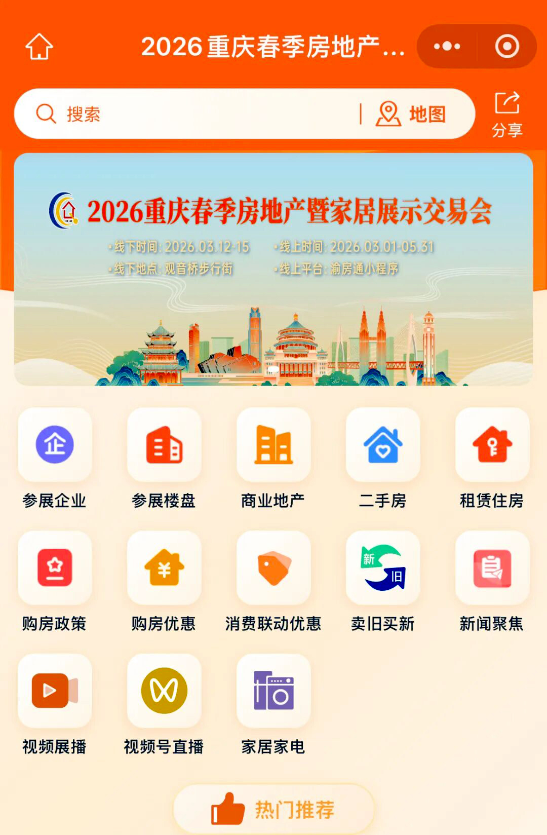为顺应数字化消费新趋势,本届春交会在渝房通平台特设专属展区,打造集房源展示、政策查询、优惠申领、消费联动、线上推介于一体的线上服务阵地。平台设置参展企业、参展楼盘、商业地产、二手房、租赁住房等12大功能板块,实现从看房选房、政策咨询到家居家电配套的全流程线上办理,让市民足不出户,就能享受便捷高效的一站式置业服务。