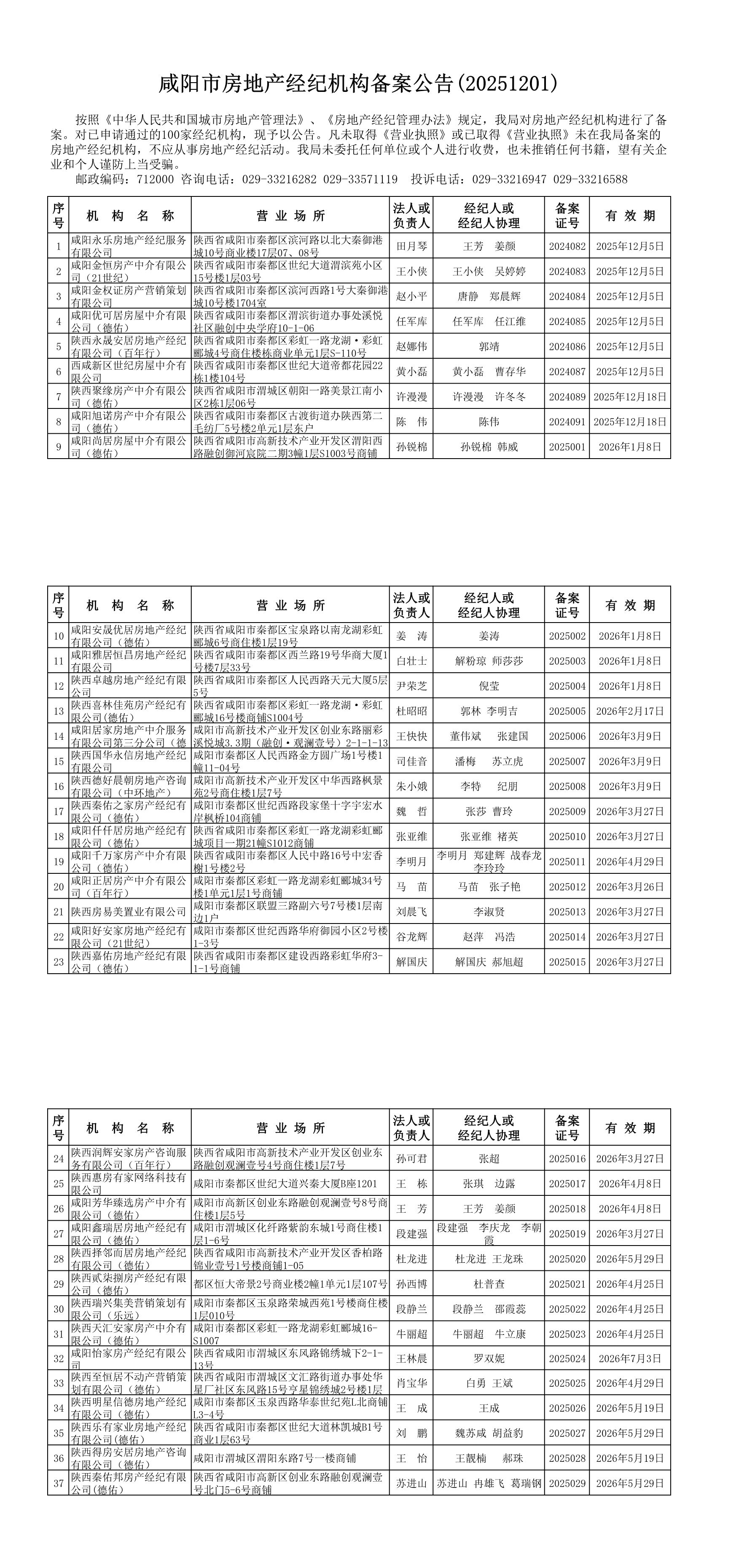 咸阳市房地产经纪机构备案公告(20251201)按照《中华人民共和国城市房地产管理法》、《房地产经纪管理办法》规定,我局对房地产经纪机构进行了备案。对已申请通过的100家经纪机构,现予以公告。凡未取得《营业执照》或已取得《营业执照》未在我局备案的房地产经纪机构,不应从事房地产经纪活动。我局未委托任何单位或个人进行收费,也未推销任何书籍,望有关企业和个人谨防上当受骗。邮政编码:712000咨询电话:029-33216282029-33571119投诉电话:029-33216947029-33216588序号机构名称营业场所法人或经纪人或负责人经纪人协理证号备案有效期1咸阳永乐房地产经纪服务陕西省咸阳市秦都区滨河路以北大秦御港有限公司城10号商业楼17层07、08号田月琴王芳姜颜20240822025年12月5日2咸阳金恒房产中介有限公陕西省咸阳市秦都区世纪大道渭滨苑小区司(21世纪)15号楼1层03号王小侠王小侠吴婷婷20240832025年12月5日3咸阳金权证房产营销策划陕西省咸阳市秦都区滨河西路1号大秦御港有限公司城10号楼1704室赵小平唐静郑晨辉20240842025年12月5日4咸阳优可居房屋中介有限陕西省咸阳市秦都区渭滨街道办事处溪悦公司(德佑)社区融创中央学府10-1-06任军库任军库任江维20240852025年12月5日5陕西永晟安居房地产经纪陕西省咸阳市秦都区彩虹一路龙湖·彩虹有限公司(百年行)郦城4号商住楼栋商业单元1层S-110号赵娜伟郭靖20240862025年12月5日6西咸新区世纪房屋中介有陕西省咸阳市秦都区世纪大道帝都花园22限公司栋1楼104号黃小磊黄小磊曹存华20240872025年12月5日7陕西聚缘房产中介有限公陕西省咸阳市渭城区朝阳一路美景江南小司(德佑)区2栋1层06号许漫漫许漫漫许冬冬20240892025年12月18日8咸阳旭诺房产中介有限公陕西省咸阳市秦都区古渡街道办陕西第司(德佑)毛纺厂5号楼2单元1层东户陈伟陈伟20240912025年12月18日9咸阳尚居房屋中介有限公陕西省咸阳市高新技术产业开发区渭阳西司(德佑)路融创御河宸院二期3幢1层S1003号商铺孙锐棉孙锐棉韩威20250012026年1月8日