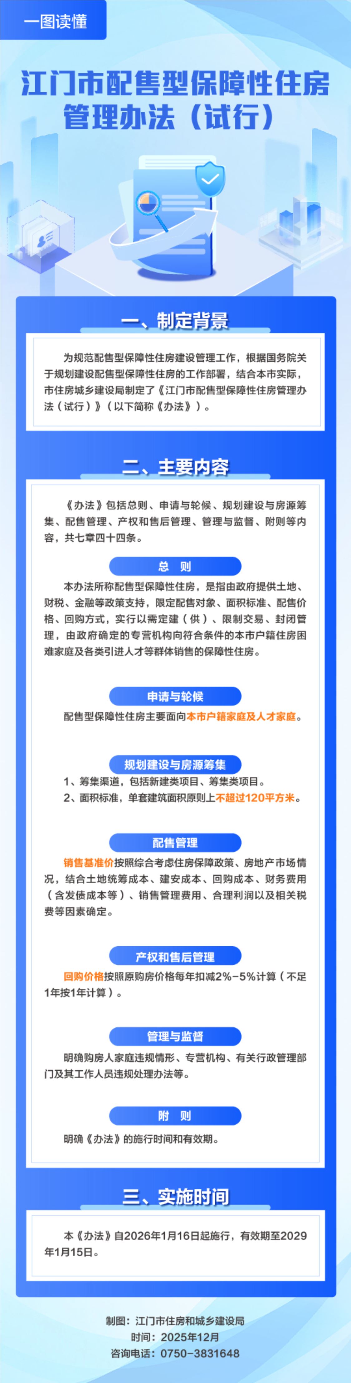 一图读懂江门市配售型保障性住房管理办法(试行)製定背景为规范配售型保障性住房建设管理工作,根据国务院关无规划律设配集型促障性住房的作立V木升守际为规范配售型保障性住房建设管理工作,根据国务院关于规划建设配售型保障性住房的工作部署,结合本市实际,市住房城乡建设局制定了《江门市配售型保障性住房管理办法(试行)》(以下简称《办法》)。二、主要内容《办法》包括总则、申请与轮候、规划建设与房源筹集、配售管理、产权和售后管理、管理与监督、附则等内容,共七章四十四条。总则本办法所称配售型保障性住房,是指由政府提供土地、财税、金融等政策支持,限定配售对象、面积标准、配售价格、回购方式,实行以需定建(供)、限制交易、封闭管理,由政府确定的专营机构向符合条件的本市户籍住房困难家庭及各类引进人才等群体销售的保障性住房。申请与轮候申请与轮候配售型保障性住房主要面向本市户籍家庭及人才家庭规划建设与房源筹集1、筹集渠道,包括新建类项目、筹集类项目。2、面积标准,单套建筑面积原则上不超过120平方米。配售管理销售基准价按照综合考虑住房保障政策、房地产市场情况,结合土地统筹成本、建安成本、回购成本、财务费用(含发债成本等)、销售管理费用、合理利润以及相关税费等因素确定。产权和售后管理回购价格按照原购房价格每年扣减2%-5%计算(不足1年按1年计算)。1年按1年计算)。管理与监督明确购房人家庭违规情形、专营机构、有关行政管理部门及其工作人员违规处理办法等。附则明确《办法》的施行时间和有效期。三、实施时间本《办法》自2026年1月16日起施行,有效期至2029年1月15日。制图:江门市住房和城乡建设局时间:2025年12月咨询电话:0750-3831648制图:江门市住房和城乡建设局时间:2025年12月咨询电话:0750-3831648