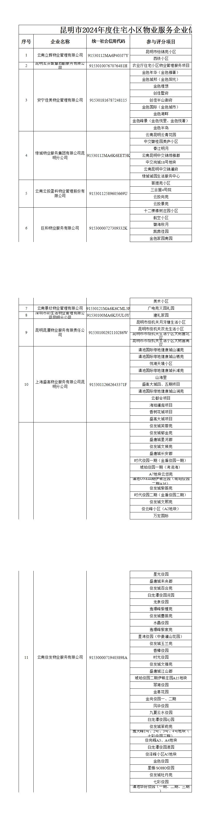 昆明市2024年度住宅小区物业服务企业信用等级名单