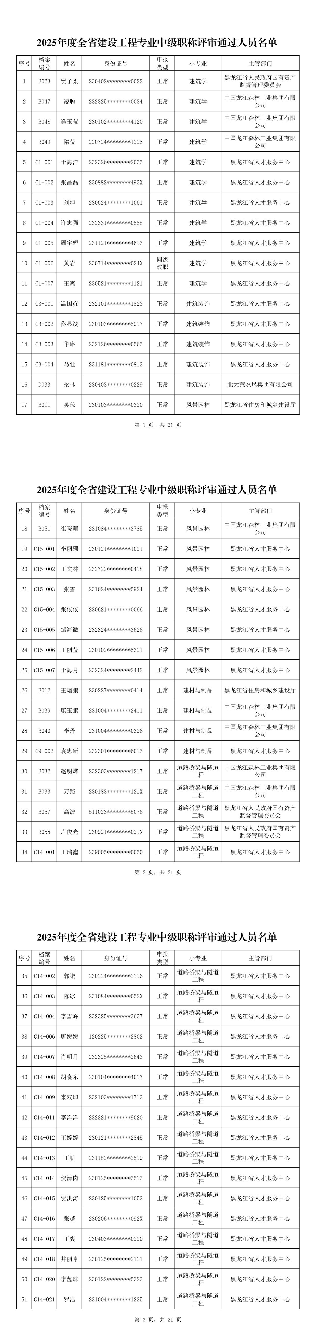 2025年度全省建设工程专业中级职称评审通过人员名单序号编号档案姓名身份证号类型申报小专业主管部门18B051崔晓萌231084********3785正常风景园林中国龙江森林工业集团有限公司19C15-001李丽颖230121********1021正常风景园林黑龙江省人才服务中心20C15-002王文林232722********0418正常风景园林黑龙江省人才服务中心21C15