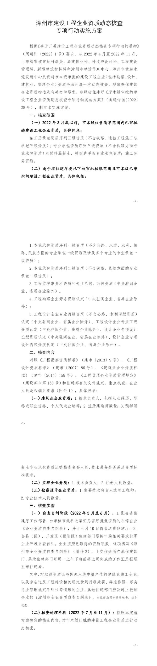 根据《关于开展建设工程企业资质动态核查专项行动的通知》(闽建许〔2022〕1号)要求,从2022年4月至2022年11月,由市局审核审批科牵头,局建筑业科、科技与设计科、工程建设管理科、新型建筑材料科和漳州市建设信息中心、漳州市散装水泥发展中心负责对市本级审批的建设工程企业(包括勘察、设计、建筑业、监理企业)资质全面开展一次动态核查。现依据住建部企业资质标准及有关文件要求,参照省住建厅《厅本级审批的建设工程企业资质动态核查专项行动实施方案》(闽建许函〔2022〕28号),制定本实施方案。