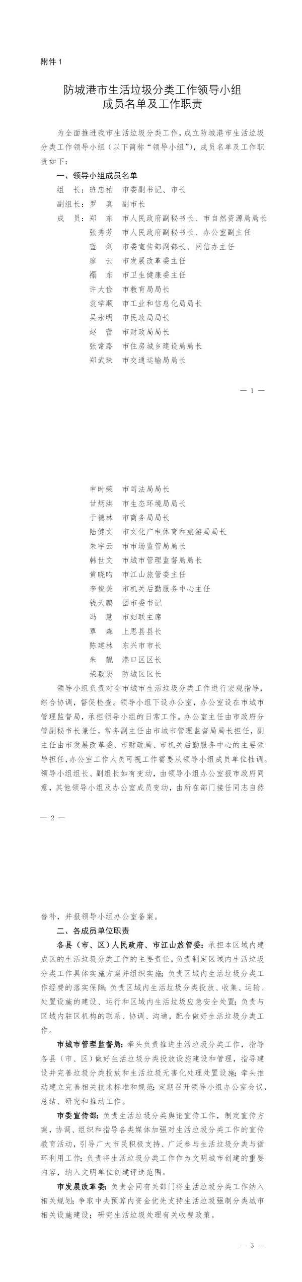 为全面推进我市生活垃圾分类工作,成立防城港市生活垃圾分类工作领导小组(以下简称“领导小组”),成员名单及工作职责如下: