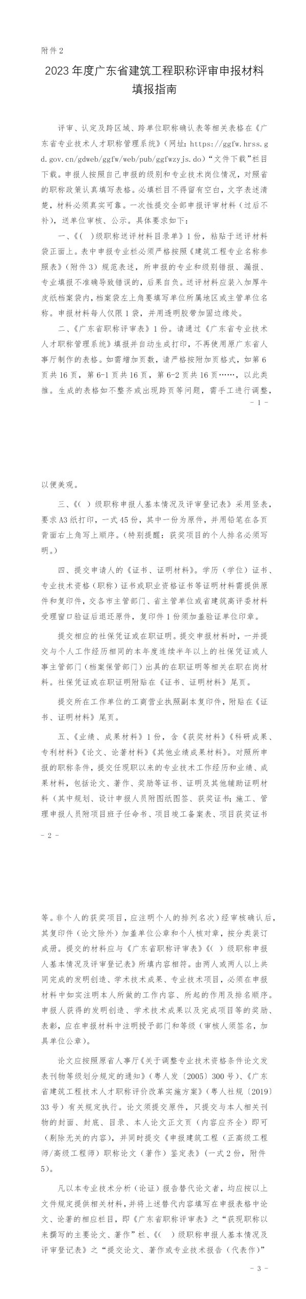 评审、认定及跨区域、跨单位职称确认表等相关表格在《广东省专业技术人才职称管理系统》(网址:https://ggfw.hrss.gd.gov.cn/gdweb/ggfw/web/pub/ggfwzyjs.do)“文件下载”栏目下载。申报人按照自己申报的级别和专业技术岗位情况,对照省的职称政策认真填写表格。必填栏目不得留有空白,文字表述清楚,材料必须真实可靠。一次性提交全部申报评审材料(过后不补),送单位审核、公示。具体要求如下:一、《()级职称送评材料目录单》1份,粘贴于送评材料袋正面上。表中申报专业栏必须严格按照《建筑工程专业名称参照表》(附件3)规范表述,所申报的专业和级别错报、漏报、专业填报不准确导致错误的,后果自负。送评材料应装入加厚牛皮纸档案袋内,档案袋左上角要填写单位所属地区或主管单位名称。申报材料每人仅限1袋,并用透明胶带加固边缘处。二、《广东省职称评审表》1份。请通过《广东省专业技术人才职称管理系统》填报并自动生成打印,不再使用原广东省人事厅制作的表格。如需增加页数,请严格按附加页格式,如第6页共16页,第6-1页共16页,第6-2页共16页……,以此类推。生成的表格如不整齐或出现跨页等问题,需手工进行调整,以便美观。