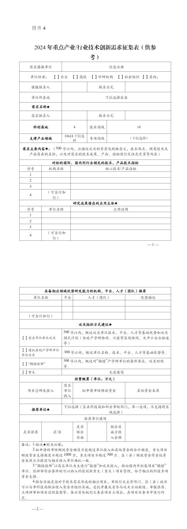 2024年重点产业/行业技术创新需求征集表(供参考)