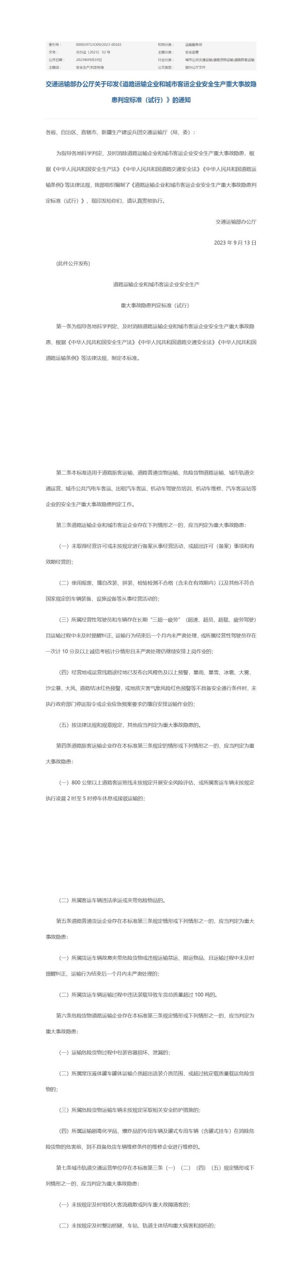 为指导各地科学判定、及时消除道路运输企业和城市客运企业安全生产重大事故隐患,根据《中华人民共和国安全生产法》《中华人民共和国道路交通安全法》《中华人民共和国道路运输条例》等法律法规,我部组织编制了《道路运输企业和城市客运企业安全生产重大事故隐患判定标准(试行)》,现印发给你们,请认真贯彻执行。