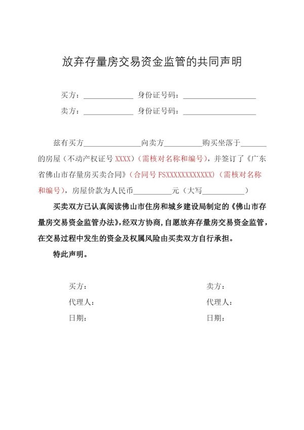买卖双方已认真阅读佛山市住房和城乡建设局制定的《佛山市存量房交易资金监管办法》,经双方协商,自愿放弃存量房交易资金监管,在交易过程中发生的资金及权属风险由买卖双方自行承担。