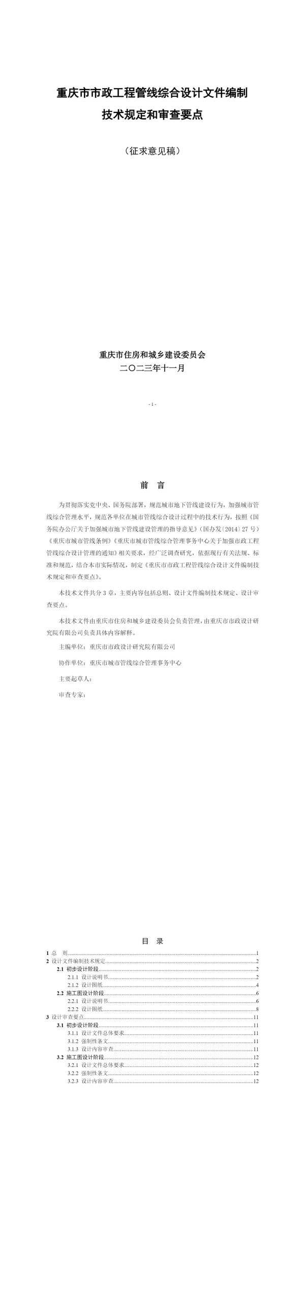 为贯彻落实党中央、国务院部署,规范城市地下管线建设行为,加强城市管线综合管理水平,规范各单位在城市管线综合设计过程中的技术行为,按照《国务院办公厅关于加强城市地下管线建设管理的指导意见》(国办发〔2014〕27号)《重庆市城市管线条例》《重庆市城市管线综合管理事务中心关于加强市政工程管线综合设计管理的通知》相关要求,经广泛调查研究,依据现行有关法规、标准和规范,结合本市实际情况,制定《重庆市市政工程管线综合设计文件编制技术规定和审查要点》。