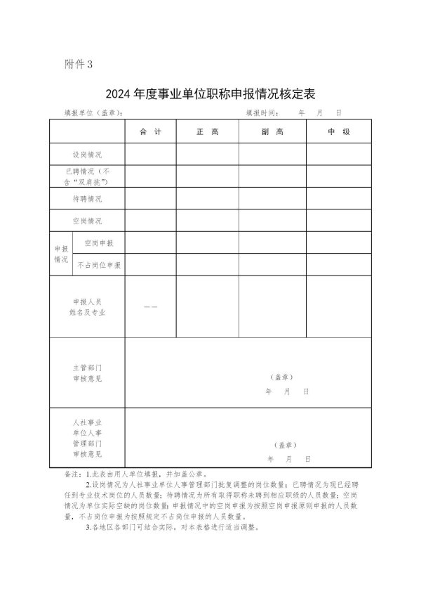 2.设岗情况为人社事业单位人事管理部门批复调整的岗位数量;已聘情况为现已经聘任到专业技术岗位的人员数量;待聘情况为所有取得职称未聘到相应职级的人员数量;空岗情况为单位实际空缺的岗位数量;申报情况中的空岗申报为按照空岗申报原则申报的人员数量,不占岗位申报为按照规定不占岗位申报的人员数量。