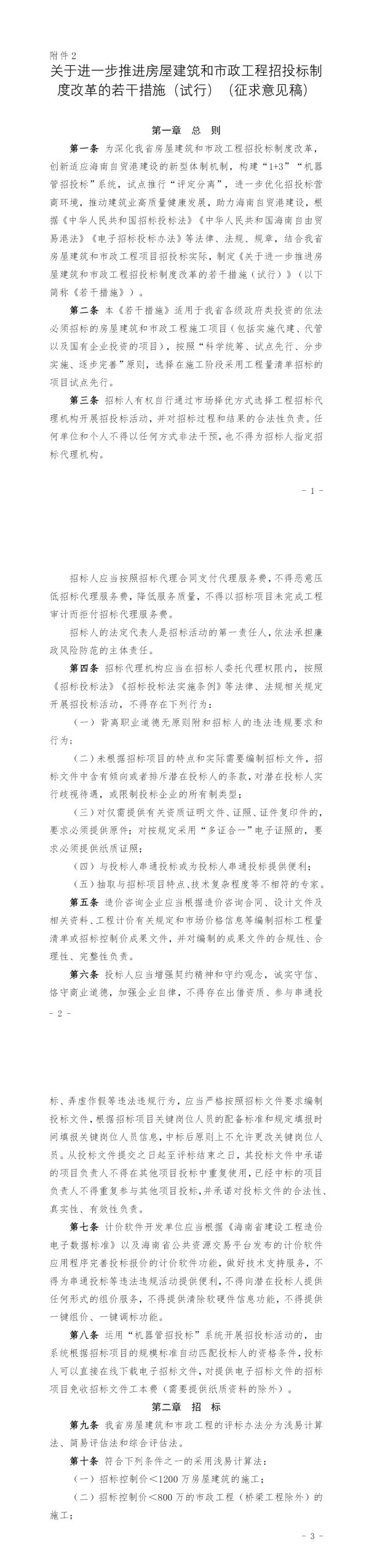 关于进一步推进房屋建筑和市政工程招投标制度改革的若干措施(试行)(征求意见稿)