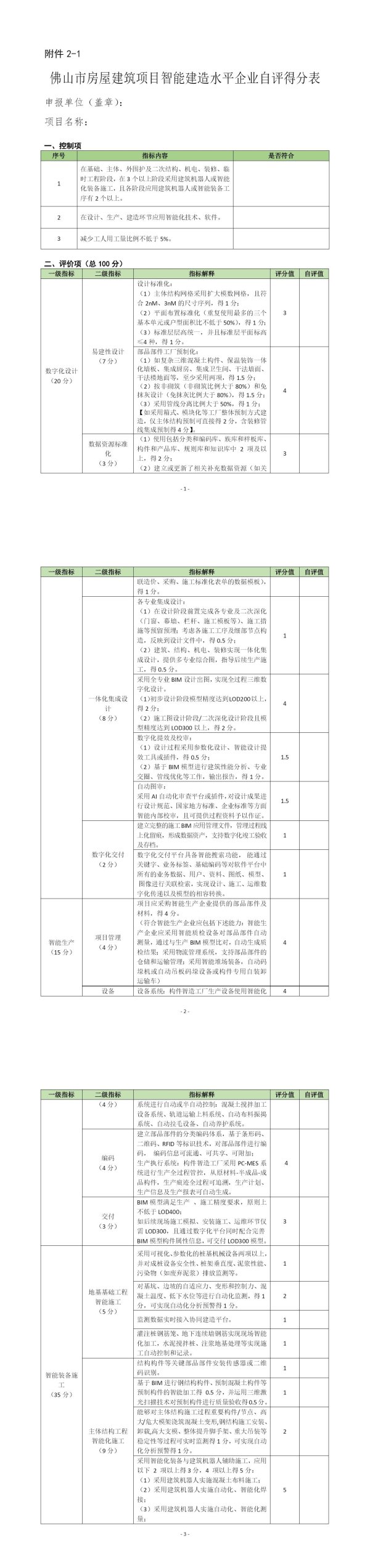 佛山市房屋建筑项目智能建造水平企业自评得分表