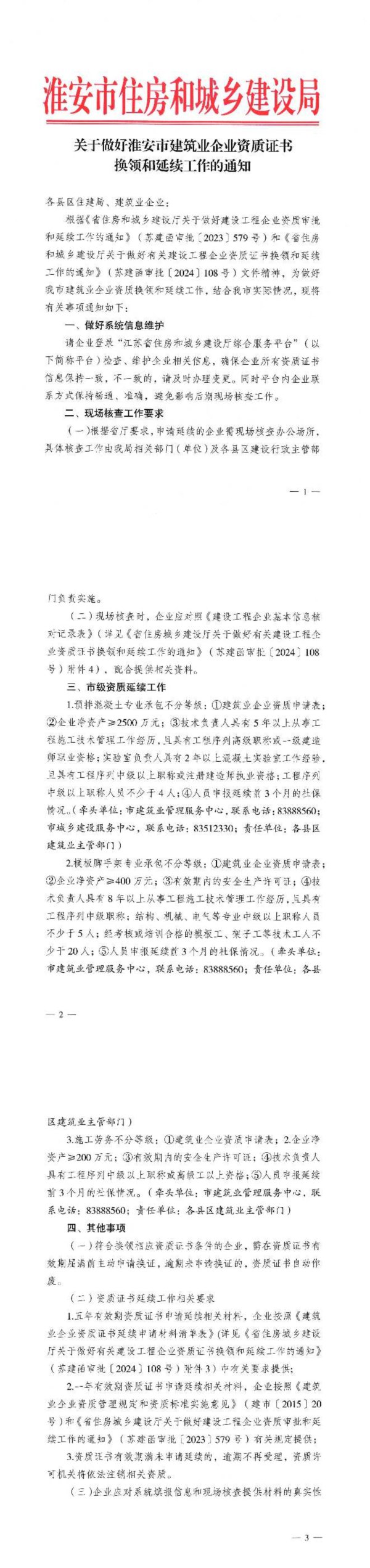 淮安市住房和城乡建设局关于做好准安市建筑业企业资质证书换领和延续工作的通知各县区住建局、建筑业企业:根据《省住房和城乡建设厅关于做好建设工程企业资质审批和延续工作的通知》(苏建函官批(2023)579号)和《省住房和城乡建设厅关于做好有关建设工程企业资质证书换领和延续工作的通知》(苏建函审批【2024】108号)文件精神,为做好我市建筑业企业资质换领和延续工作,结合我市实际情况,现将有关享项通知如下:一、做好系统信息维护请企业登录“江苏省住房和城乡建设厅综合服务平台”(以下简称平台)检查、维护企业相关信息,确保企业所有资质证书信息保持一致,不一致的,请及时办理变更。同时平台内企业联系方式保持畅通、准确,避免影响后期现场核查工作。二、现场核查工作要求(一)根据省厅要求,申请延续的企业需现场核查办公场所,具体核查工作由我局相关部门(单位)及各县区建设行政主管部