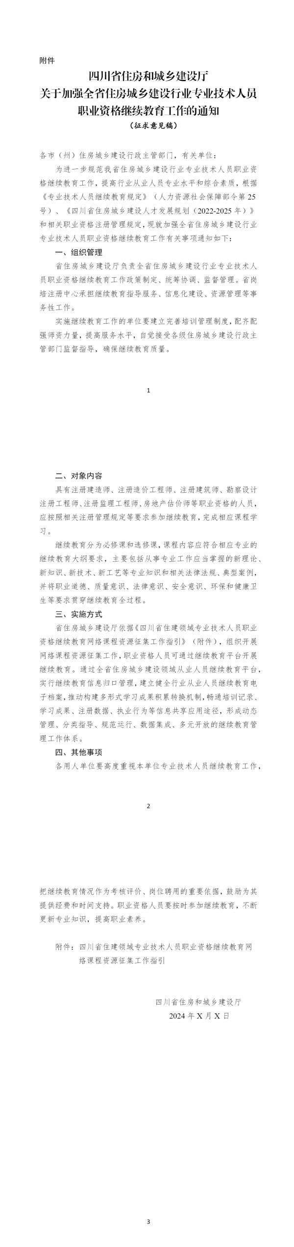 省住房城乡建设厅依据《四川省住建领域专业技术人员职业资格继续教育网络课程资源征集工作指引》(附件),组织开展网络课程资源征集工作,职业资格人员可通过继续教育平台开展继续教育。通过全省住房城乡建设领域从业人员继续教育平台,实行继续教育信息归口管理,建立健全行业从业人员继续教育电子档案,推动构建多形式学习成果积累转换机制,畅通培训记录、学习成果、注册数据、执业行为等信息共享应用途径,形成动态管理、分类指导、规范运行、数据集成、多元开放的继续教育管理工作体系。