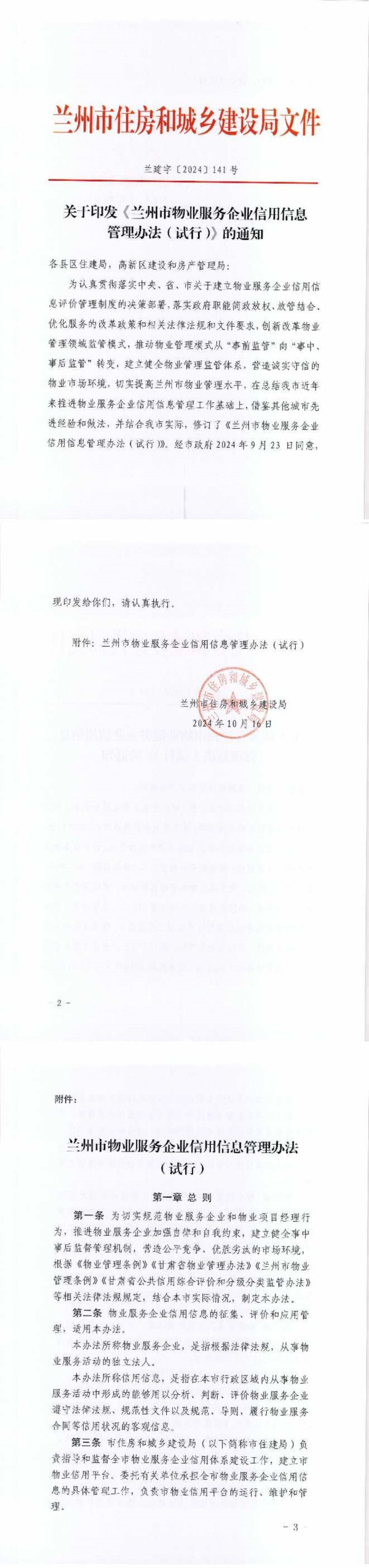 兰州市住房和城乡建设局文件兰建字[2024]141号关于印发《兰州市物业服务企业信用信息管理办法(试行)的通知各县区住建局,高新区建设和房产管理局:为认真贯彻落实中央、省、市关于建立物业服务企业信用信息评价管理制度的决策部署,落实政府职能简政放权、放管结合、优化服务的改革政策和相关法律法规和文件要求,创新改革物业管理领域监管模式,推动物业管理模式从“事前监管”向“事中、事后监管”转变,建立健全物业管理监管体系,营造诚实守信的物业市场环境,切实提高兰州市物业管理水平,在总结我市近年来推进物业服务企业信用信息管理工作基础上,借鉴其他城市先进经验和做法,并结合我市实际,修订了《兰州市物业服务企业信用信息管理办法(试行)》。经市政府2024年9月23日同意,