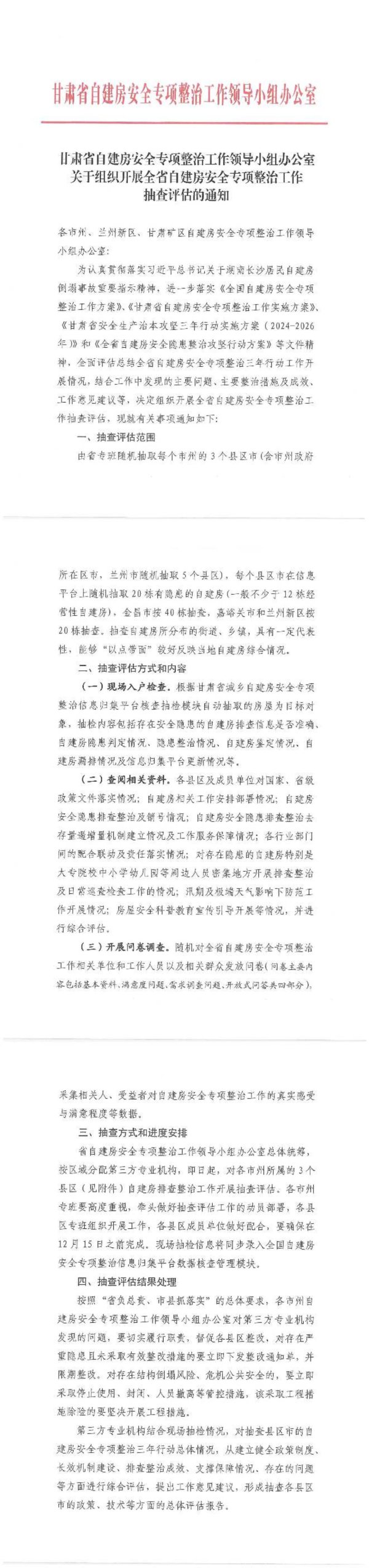 甘肃省自建房安全专项整治工作领导小组办公室肃省自建房安全专项整治工作领导小组办公室关于组织开展全省自建房安全专项整治工作抽查评估的通知各市州、兰州新区、甘肃矿区自建房安全专项整治工作领导小组办公室:为认真贯彻落实习近平总书记关于湖南长沙居民自建房倒塌事故重要指示精神,进一步落实《全国自建房安全专项整治工作方案》、《计肃省自建房安全专项整治工作实施方案》、《甘肃省安全生产治本攻坚三年行动实施方案(2024-2026年)》和《全省自建房安全隐患整治攻坚行动方案》等文件精神,全面评估总结全省自建房安全专项整治三年行动工作开展情况,结合工作中发现的主要问题、主要整治措施及成效、工作意见建议等,决定组织开展全省自建房安全专项整治工作抽查评估,现就有关事项通知如下:一、抽查评估范围由省专班随机抽取每个市州的3个县区市(含市州政府