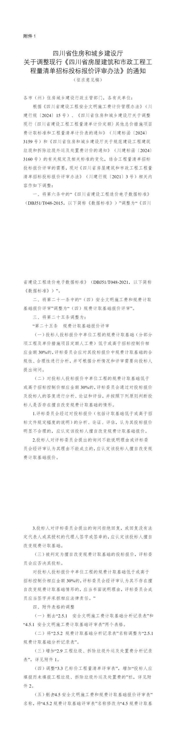 根据《四川省建设工程安全文明施工费计价管理办法》(川建行规〔2024〕15号)、《四川省住房和城乡建设厅关于调整现行〈四川省建设工程工程量清单计价定额〉其他总价措施项目费计取标准和工程量清单计价表的通知》(川建标函〔2024〕3159号)和《四川省住房和城乡建设厅关于规范建设工程建筑垃圾和拆除垃圾外运及处置费计价的通知》(川建标函〔2024〕3160号)的有关规定及相关标准的变化,结合工程量清单招标投标报价评审的需要,现对《四川省房屋建筑和市政工程工程量清单招标投标报价评审办法》(川建行规〔2021〕3号)相关内容作如下调整:
