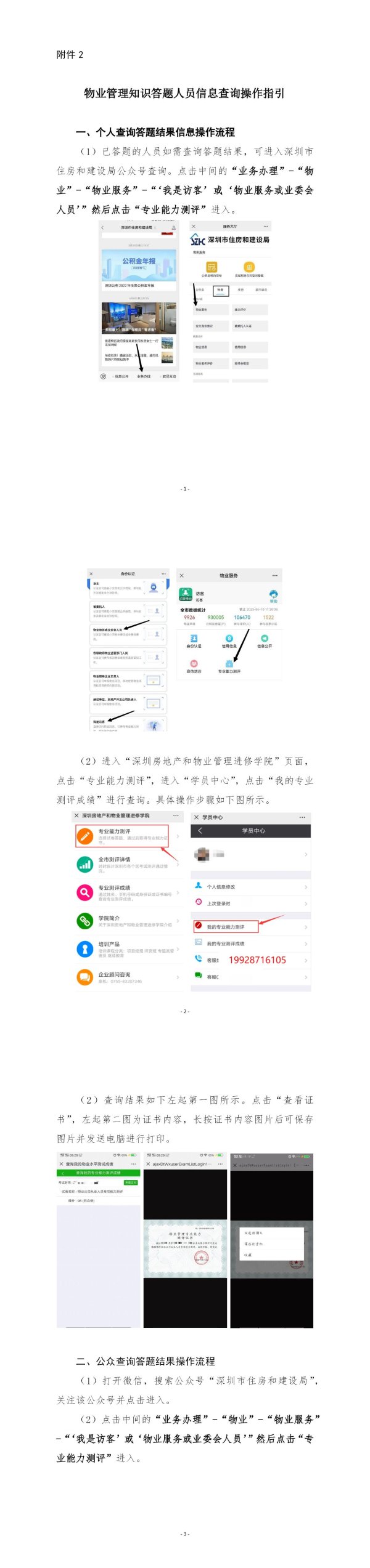 (1)已答题的人员如需查询答题结果,可进入深圳市住房和建设局公众号查询。点击中间的“业务办理”-“物业”-“物业服务”-“‘我是访客’或‘物业服务或业委会人员’”然后点击“专业能力测评”进入。
