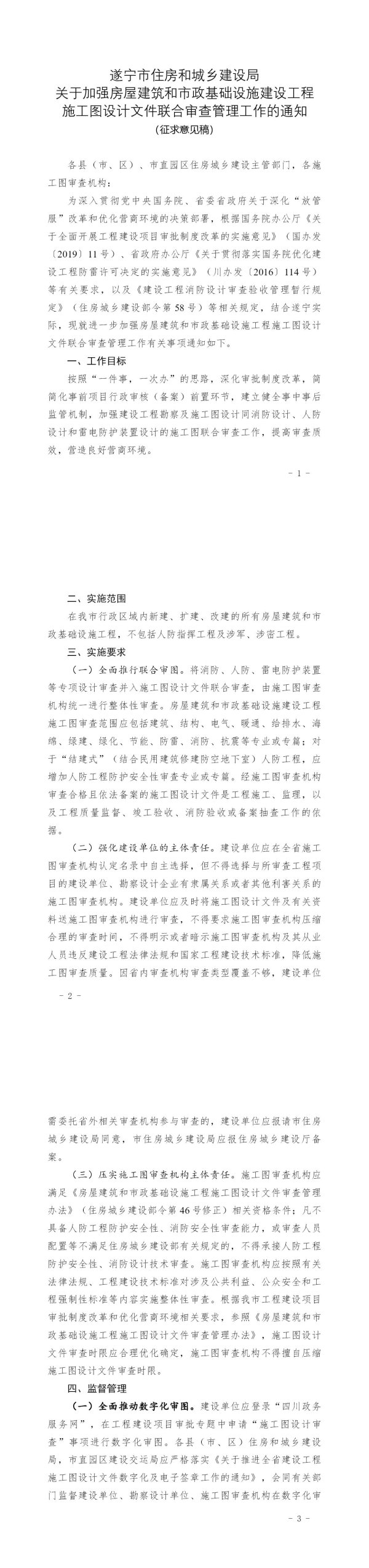 为深入贯彻党中央国务院、省委省政府关于深化“放管服”改革和优化营商环境的决策部署,根据国务院办公厅《关于全面开展工程建设项目审批制度改革的实施意见》(国办发〔2019〕11号)、省政府办公厅《关于贯彻落实国务院优化建设工程防雷许可决定的实施意见》(川办发〔2016〕114号)等有关要求,以及《建设工程消防设计审查验收管理暂行规定》(住房城乡建设部令第58号)等相关规定,结合遂宁实际,现就进一步加强房屋建筑和市政基础设施工程施工图设计文件联合审查管理工作有关事项通知如下。