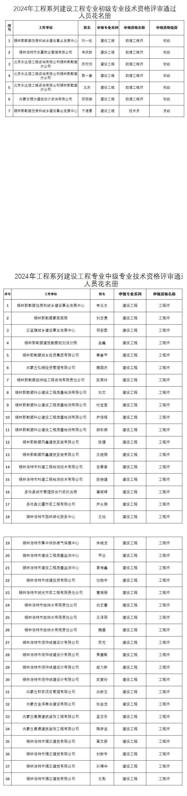 锡林郭勒2024年工程系列建设工程专业中、初级专业技术资格评审通过人员花名册