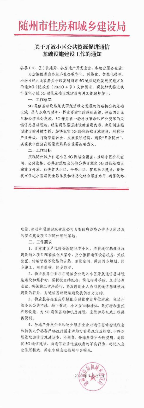 电信、移动和联通口家省级公司与市政府线略合作协议所涉及的重点建设项目在随州顺利落地。三、工作要求1、开发建设单位投资新建住宅小区,应将通信基础设施建设纳入项目配套规划方案中,充分预留通信设备机房、天线位置、传输管线等设施的安装、建设空间,做到同步规划、同步施工、同步验收、同步维护。2、物业服务企业在在通信企业进入小区开展通信基础设施建设和维护时,要积极支持配合,简化相关手续,主动协调业主,确保施工有序送行。要及时制止人为阻扰通信基础设施建设的行为,为通信基础设施建设提供有力支持。3、物业服务企业应积极配合通信建设单位进驻,主动开放小区公共空地、地下管道、小区屋面和墙体、路灯杆和监控杆等设施,为5G通信基站和机房建设、光缆和外电施工等提供便利。4、房地产开发企业和物业服务企业对通信基站场地租金和转供电价格要严格执行国家和地方有关规定及标准,不得违规收取通信设施进场费、协调费、分摊费等不合理费用。对阻扰5G通信建设、向通信企业违规收费的不良行为,将记入企业信用档案,并在市级企业信用平台曝光。科2020年茶7月270福