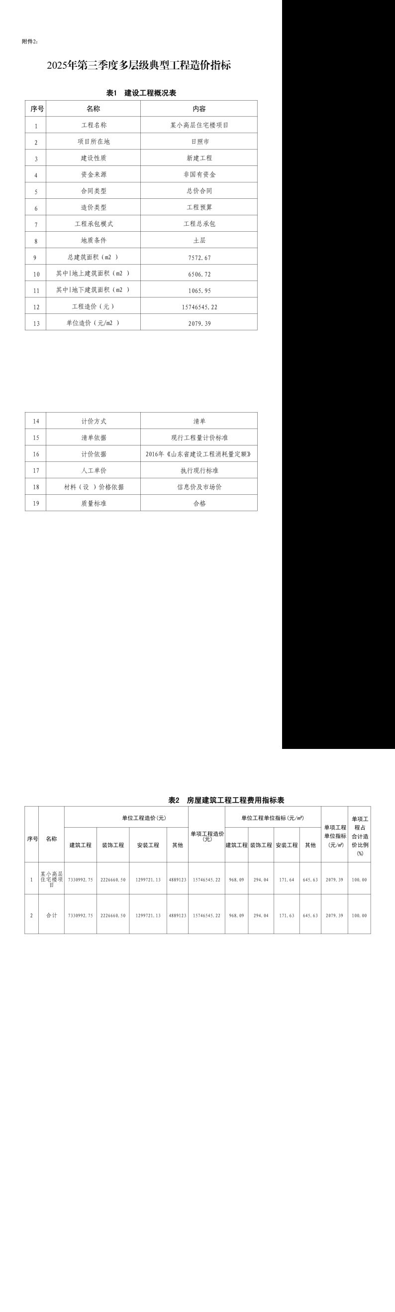 附件2:2025年第三季度多层级典型工程造价指标表1建设工程概况表序号名称内容1工程名称某小高层住宅楼项目2项目所在地日照市3建设性质新建工程4资金来源非国有资金5合同类型总价合同6造价类型工程预算7工程承包模式工程总承包8地质条件土层9总建筑面积(m2)7572.6710其中|地上建筑面积(m2)6506.7211其中|地下建筑面积(m2)1065.9512工程造价(元)15746545.2213单位造价(元/m2)2079.39
