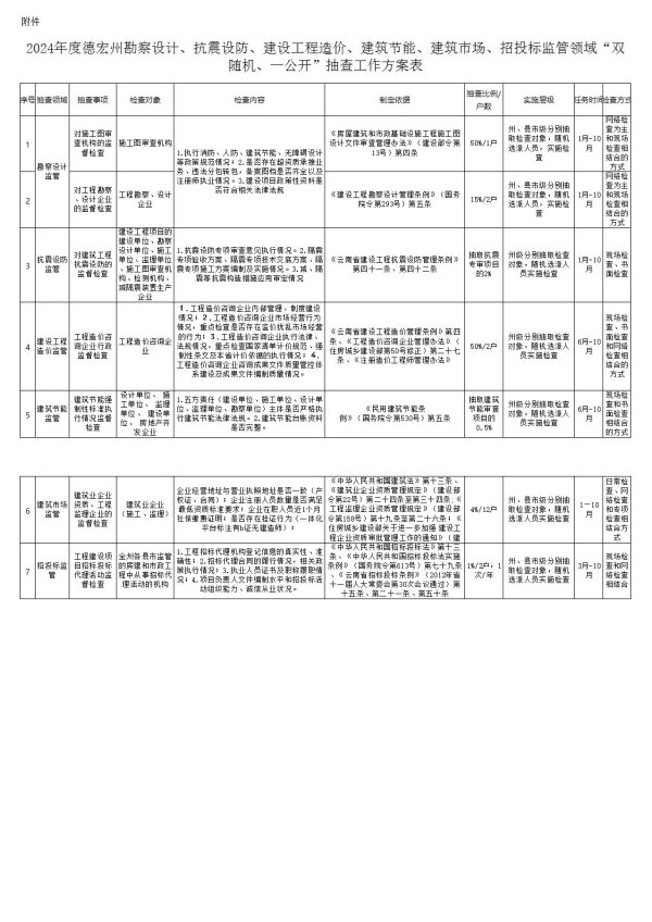 2024年度德宏州勘察设计、抗震设防、建设工程造价、建筑节能、建筑市场、招投标监管领域“双随机、一公开”抽查工作方案表