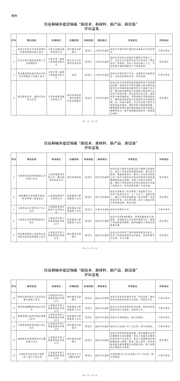 附件住房和城乡建设领域“新技术、新材料、新产品、新设备”评审意见序号事项名称申请单位所属类别申请类型推荐单位评审意见评审结论1快速定位固定多类型道路桿太原市政建设集城市建设品质提升新技术太原市住建局求。该技术申请材料中提供的成果鉴定不符合要件基础预埋件施工技术团有限公司不符合要求该技术涉及的水泥裱花和鏊假石等施工工2历史古街外墙装饰复原工艺太原市第一建筑艺,在历史文化保护传承中呈现出的“修旧及修缮技术工程集团有限公城乡历史文化太原市住建局符合要求司保护传承利用新技术如旧”的效果,形成了标准化施工工艺,为同类型古建装饰提供了可借鉴经验。高灵敏湿陷性地区超大异形太原市第一建筑3工程集团有限公其他新技术太原市住建局该技术申请材料不齐全,未提供科技查新报沉井高精度下沉施工技术告,未形成有效的专利、科技成果。不符合要求司该综合技术采用超低能耗建筑局部气密性测试装置、钢结构中外围护墙板上被动窗外挂固定技术和超低能耗建筑室内门套换气技术等,解决超低能耗技术在装配式钢结构中应超低能耗技术、装配式技术大同泰瑞集团建绿色低碳发展用的气密性问题。通过屋顶光伏支架、钢管4束剪力墙穿墙管道、沉降观测点等断热桥技综合应用设有限公司、城市更新和新技术大同市住建局术,解决超低能耗技术在钢结构中的热桥问符合要求住宅品质提升题,进一步减少能耗。并应用长度可调节式桁架底板成型机、钢管束剪力墙浇筑装置、薄壁钢管束填充墙和装配钢板式填充混凝土楼梯等技术,提升建筑整体装配率,提高施工效率。第1页,共9页