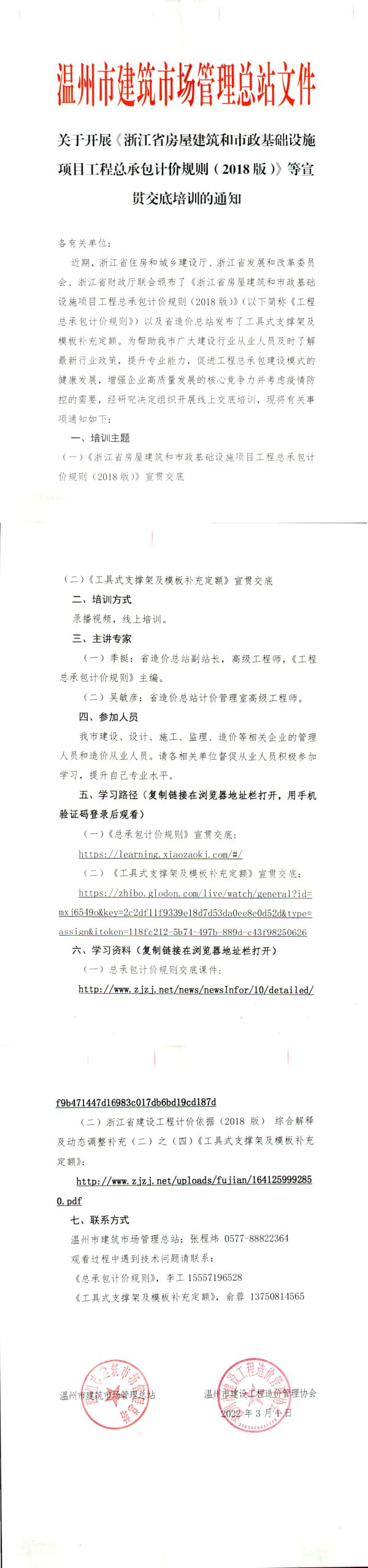温州市建筑市场管理总站文件关于开展《浙江省房屋建筑和市政基础设施项目工程总承包计价规则(2018版)》等宣贯交底培训的通知各有关单位:近期,浙江省住房和城乡建设厅、浙江省发展和改革委员会、浙江省财政厅联合颁布了《浙江省房屋建筑和市政基础设施项目工程总承包计价规则(2018版)》(以下简称《工程总承包计价规则》)以及省造价总站发布了工具式支撑架及模板补充定额。为帮助我市广大建设行业从业人员及时了解模板补充定额。为帮助我市厂天建设行业从业人员及时了解最新行业政策,提升专业能力,促进工程总承包建设模式的健康发展,增强企业高质量发展的核心竞争力并考虑疫情防控的需要,经研究决定组织开展线上交底培训,现将有关事项通知如下:一、培训主题(一)《浙江省房屋建筑和市政基础设施项目工程总承包计(一)《浙江省房屋建筑和市政基础设施项目工程总承包计价规则(2018版)》宣贯交底