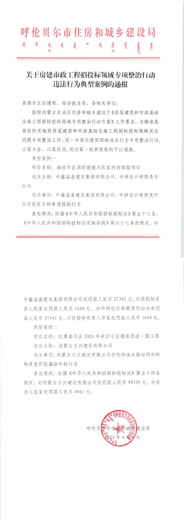 中鑫溢嘉建设集团有限公司处罚款人民币27342元、对其投标负责人程某处罚款人民币1640元、对中祥设计有限责任公司处罚款人民币27342元、对其投标负责人华某处罚款人民币1640元。典型案例二项目名称:扎赉诺尔区2024年老旧小区楼房改造一期工程违法主体:内蒙古万兴建设有限公司违法事实:内蒙古万兴建设有限公司存在伪造证据证明材料和弄虚作假骗取中标行为查处情况:依据《中华人民共和国招标投标法》第五十四条规定,对内蒙古万兴建设有限公司处罚款人民币99229元,对其法人张某处罚款人民币4961元。呼伦贝T市和城建设局財日