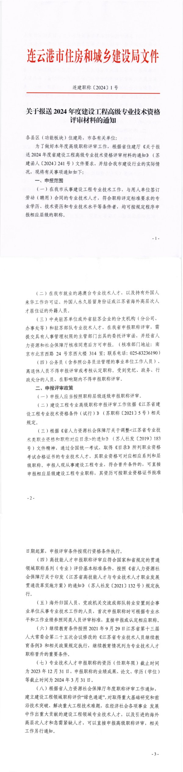 连云港市住房和城乡建设局文件连建职称[2024]1号关于报送2024年度建设工程高级专业技术资格评审材料的通知各县区(功能板块)住建局,市各有关单位:为了做好本年度高级职称评审工作,根据省住建厅《关于报送2024年度省建设工程高级专业技术资格评审材料的通知》(苏建函人[2024】241号)文件要求,并结合我市建设行业的实际情况,现将有关事项通知如下:一、申报范围(一)在我市从事建设工程专业技术工作,与用人单位签订劳动(聘用)合同的专业技术人才,符合职称评定标准要求的专业学历、技术资历和专业技术水平等条件者,均可按规定程序申报相应层级的职称。-1-