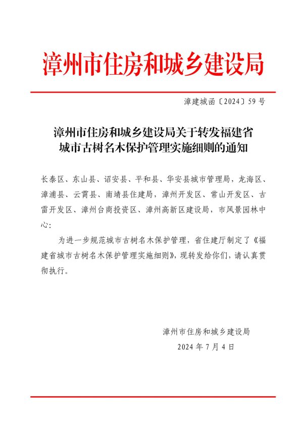 漳州市住房和城乡建设局漳建城函[2024】59号漳州市住房和城乡建设局关於转发福建省城市古树名木保护管理实施细则的通知长泰区、东山县、诏安县、平和县、华安县城市管理局,龙海区、漳浦县、云霄县、南靖县住建局,漳州开发区、常山开发区、古雷开发区、漳州台商投资区、漳州高新区建设局,市风景园林中心:为进一步规范城市古树名木保护管理,省住建厅制定了《福建省城市古树名木保护管理实施细则》,现转发给你们,请认真贯彻执行。漳州市住房和城乡建设局2024年7月4日