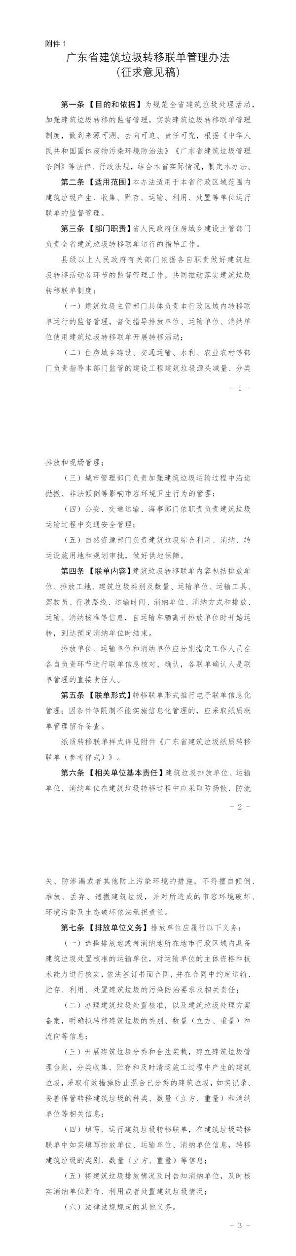 【目的和依据】为规范全省建筑垃圾处理活动,加强建筑垃圾转移的监督管理,实施建筑垃圾转移联单管理制度,做到来源可溯、去向可追、责任可究,根据《中华人民共和国固体废物污染环境防治法》《广东省建筑垃圾管理条例》等法律、行政法规,结合本省实际情况,制定本办法。