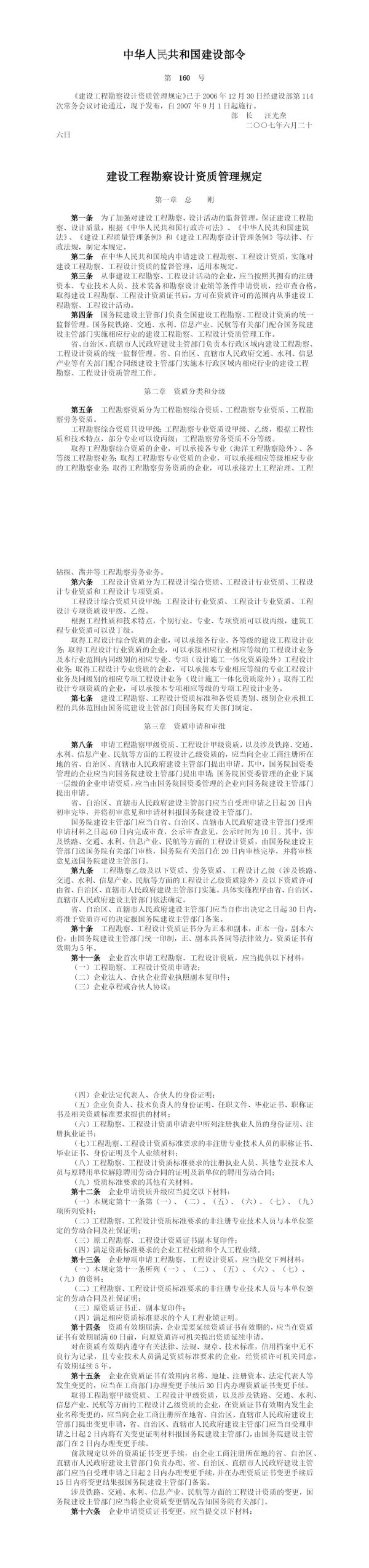 《建设工程勘察设计资质管理规定》已于2006年12月30日经建设部第114次常务会议讨论通过,现予发布,自2007年9月1日起施行。部长汪光焘二○○七年六月二十六日