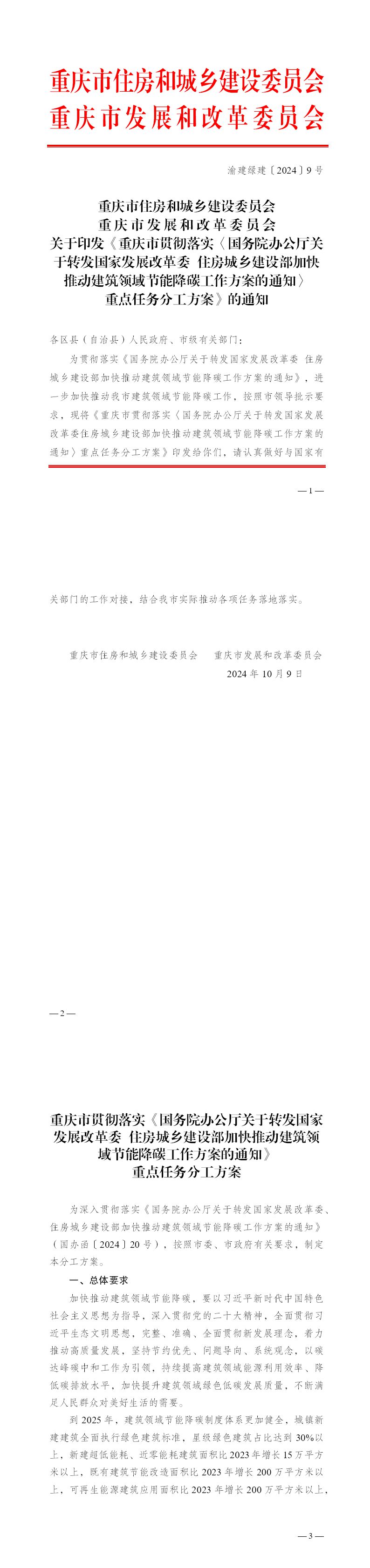 为贯彻落实《国务院办公厅关于转发国家发展改革委 住房城乡建设部加快推动建筑领域节能降碳工作方案的通知》,进一步加快推动我市建筑领域节能降碳工作,按照市领导批示要求,现将《重庆市贯彻落实〈国务院办公厅关于转发国家发展改革委住房城乡建设部加快推动建筑领域节能降碳工作方案的通知〉重点任务分工方案》印发给你们,请认真做好与国家有关部门的工作对接,结合我市实际推动各项任务落地落实。